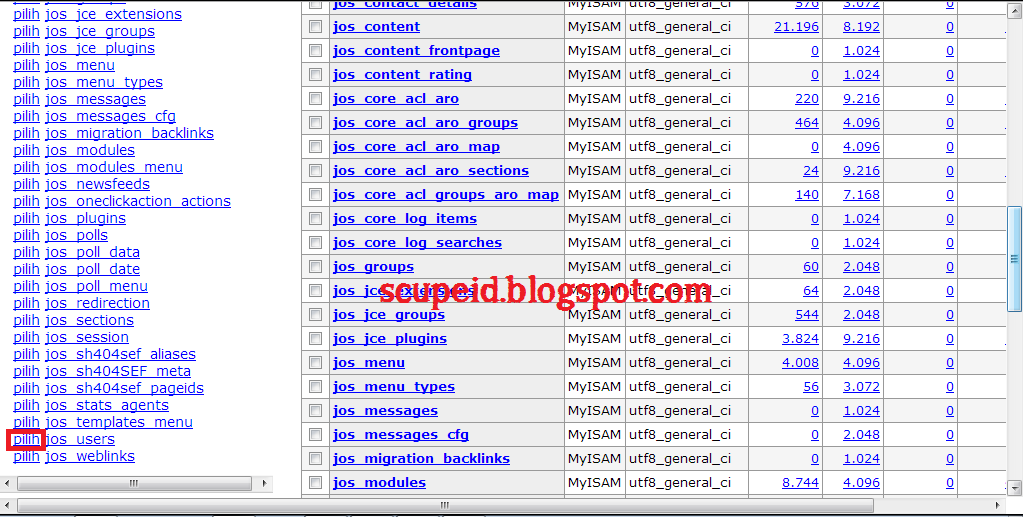 5. Klik tab pilih di sebelah kiri Jos User untuk web joomla dan wp_users untuk web wordpress.